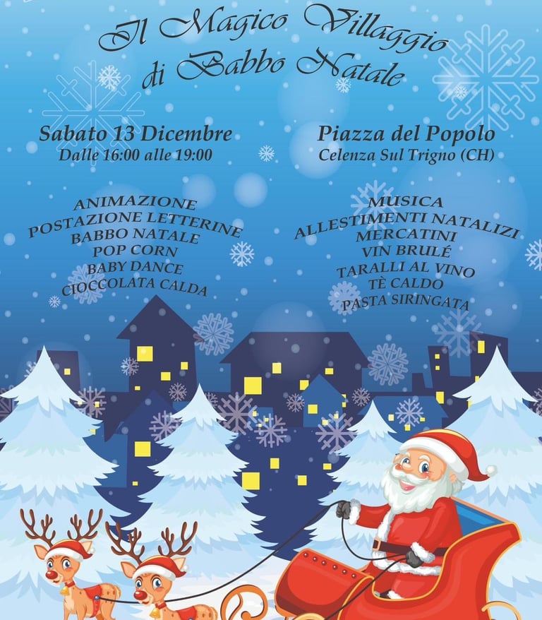 “Il Magico Villaggio di Babbo Natale”, un evento natalizio ricco di atmosfera che si terrà sabato 13 dicembre, dalle 16:00 alle 19:00, nella suggestiva Piazza del Popolo a Celenza sul Trigno (CH).